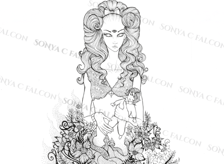Colored illustration with shading, skin texture, and eye details. Includes a basic background (see example image).